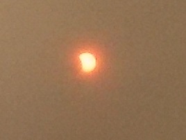 I held the filter over the camera lens of the cell phone and tried to take a picture. First one I forgot to turn off the flash, but the sun surprisingly came through despite the flash reflection off the filter. The second one is weird -- I think the large round blob of light is reflection from the camera lens onto the filter. And then there is the actual eclipsed sun, smaller, but still visible.
