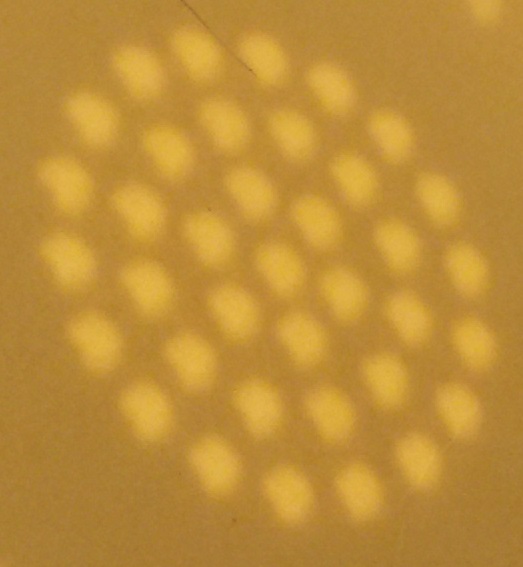 I got a pretty good view of maybe 40% eclipse (and waning) through the filter. It took the couple of tries to figure out the right distance to hold the colander and the right angle to hold the notebook to get the images. Then there was messing with the camera, so by the time I got pictures the eclipse was getting to be done.