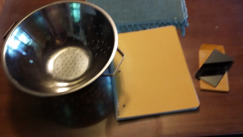 First I grabbed my equipment: "pinhole camera" colander (eclipses are apparently Pastafarian), notebook to use as a screen for said pinhole camera, and my solar filter.